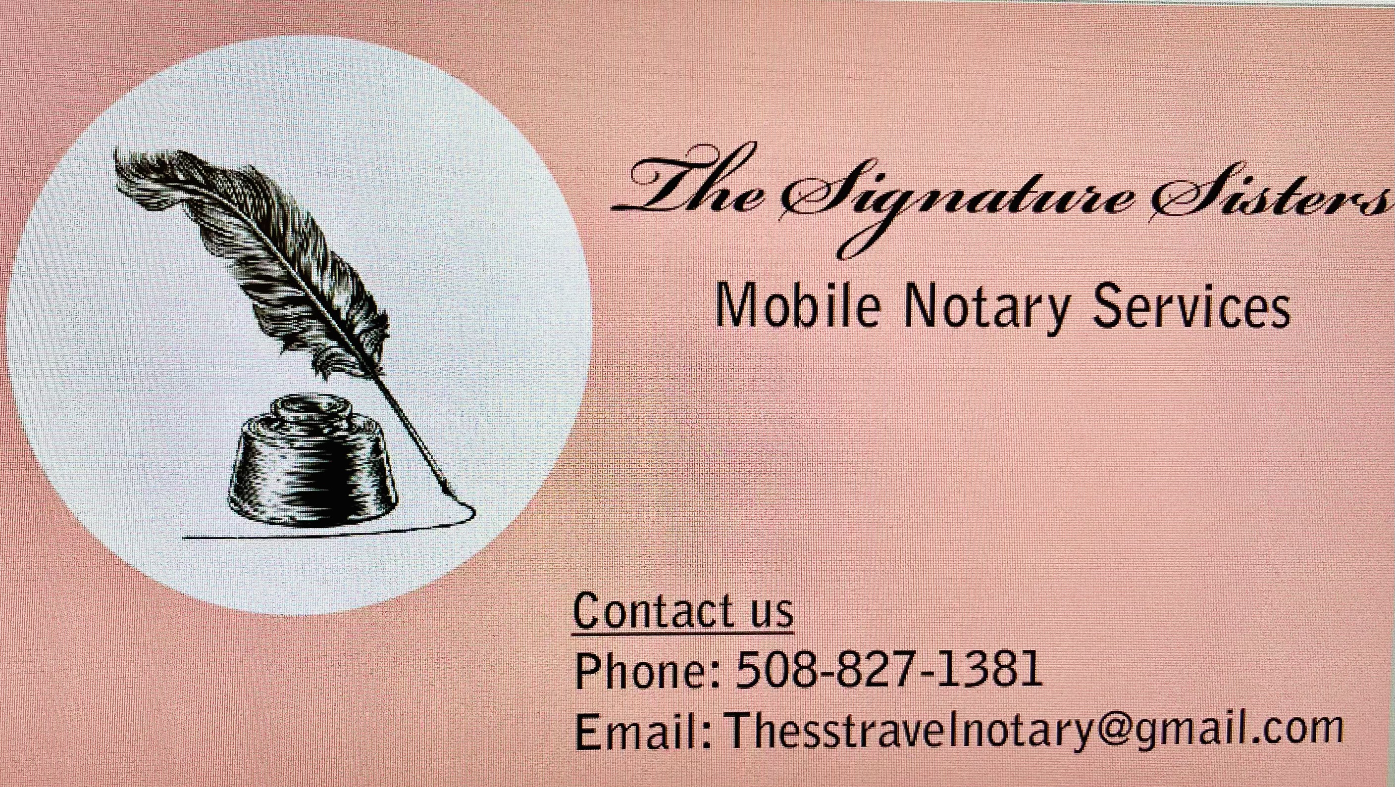 The Signature Sisters is a mobile notary service. We are dedicated to providing convenient and reliable notarization for individuals and small businesses in the area. We will travel to you! We are happy to make legal documents a little bit easier!